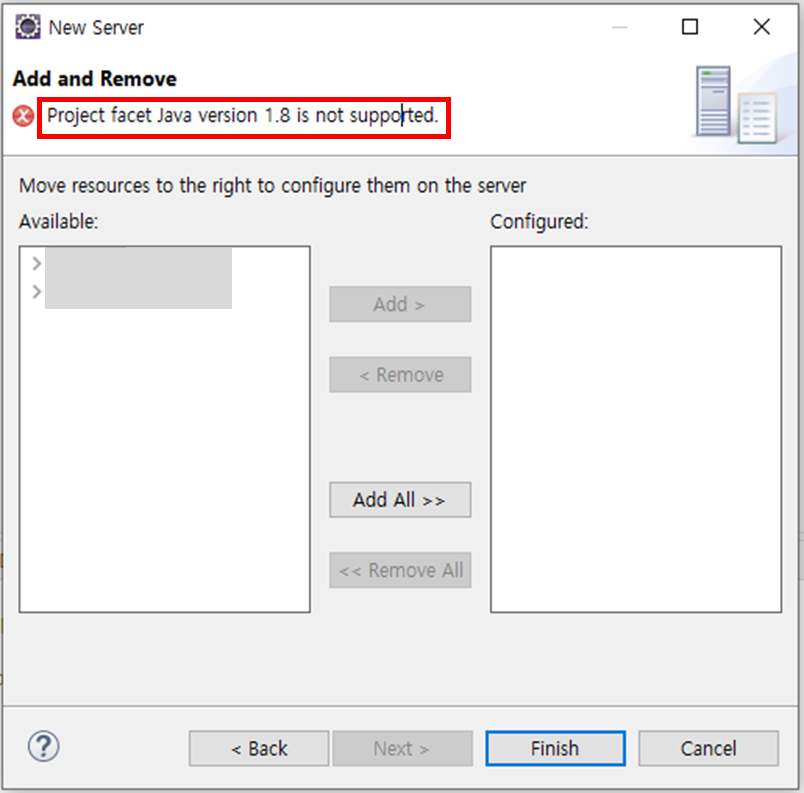 이클립스에서 WAS 추가할 때 발생하는 에러