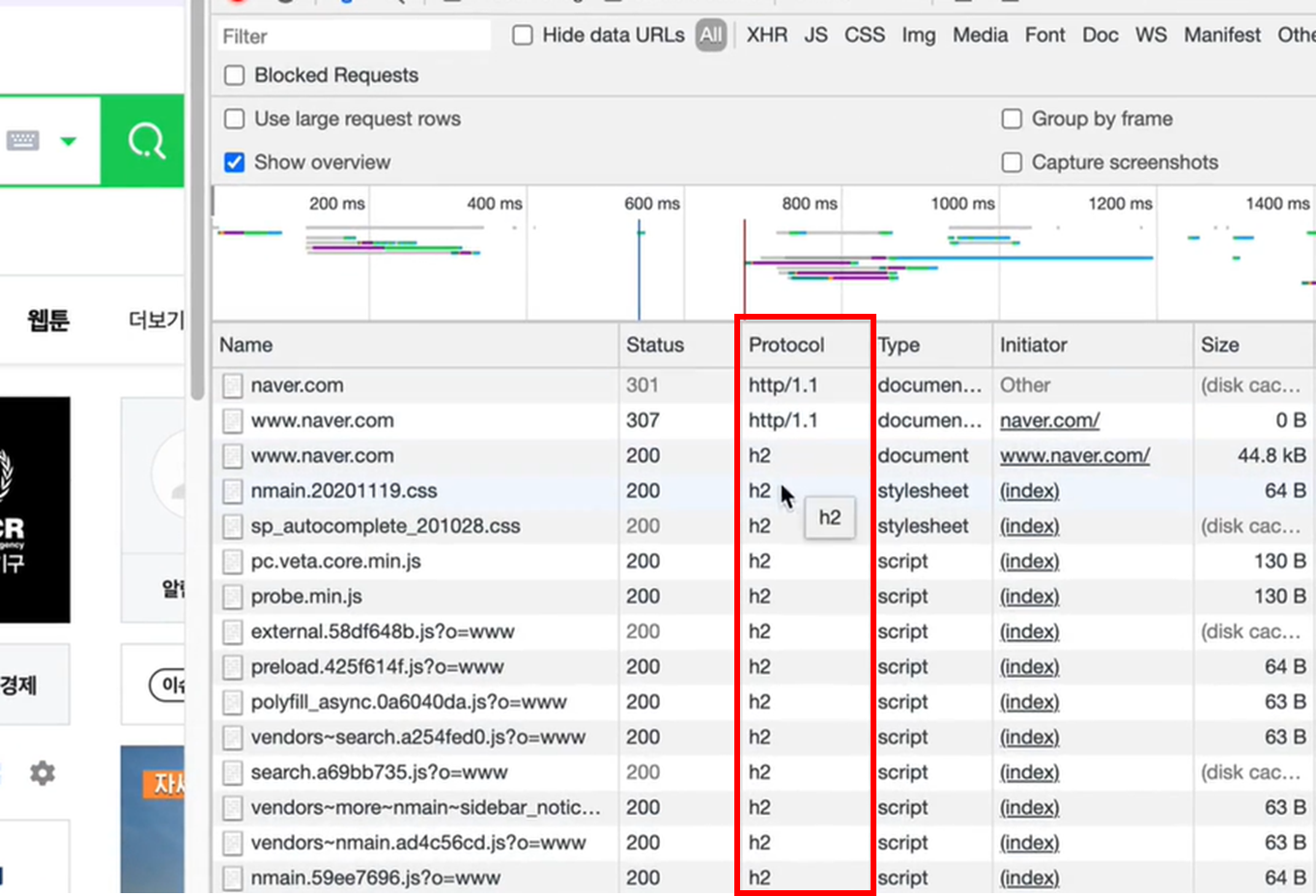 F12 누른후에 Network 탭에서 protocol 정보확인할 수 있음.
