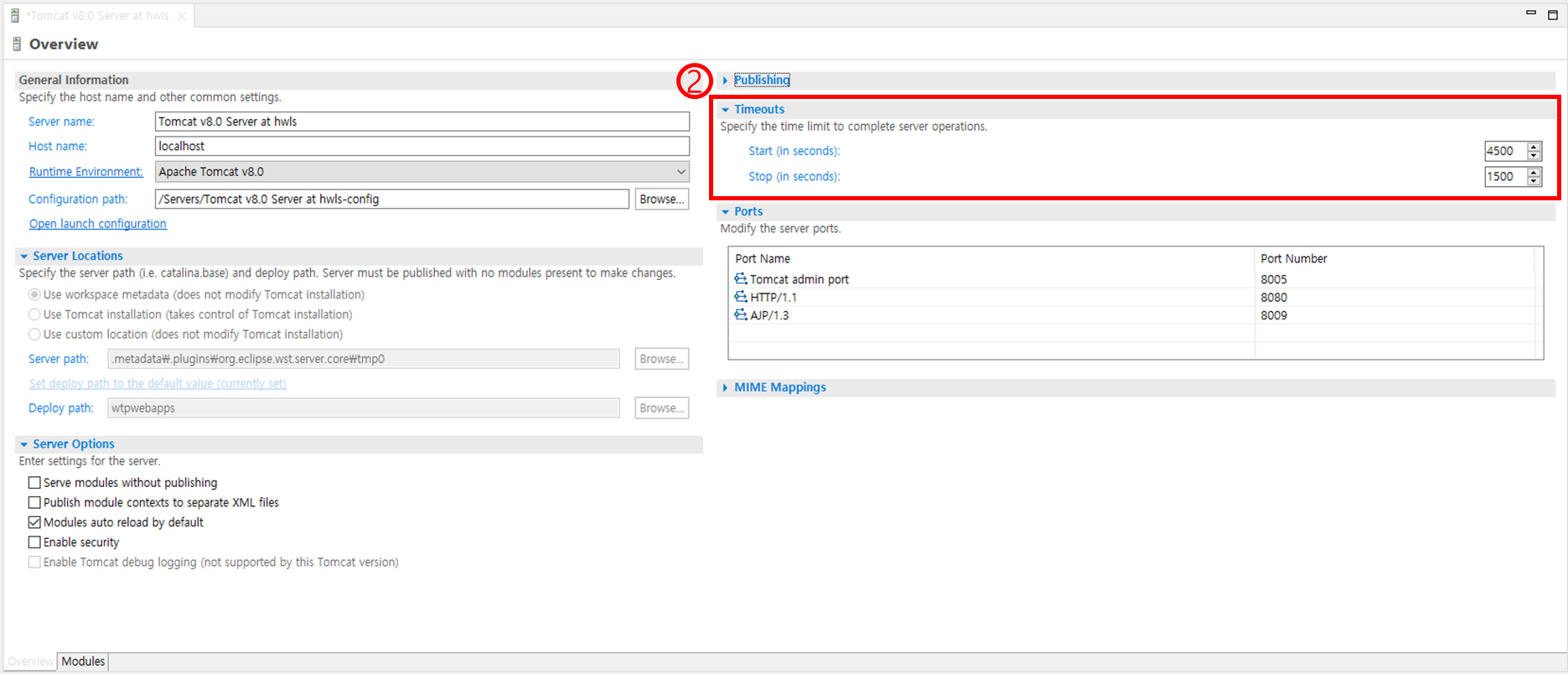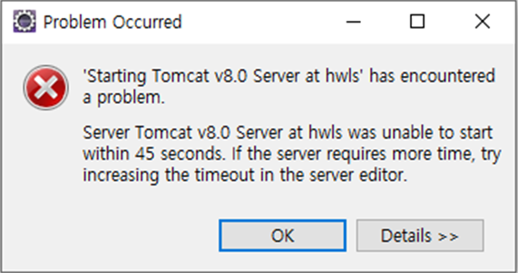 [Eclipse] Server Tomcat v8.0 Server at localhost was unable to start within 45 seconds. If the server requires more time, try increasing the timeout in the server editor.