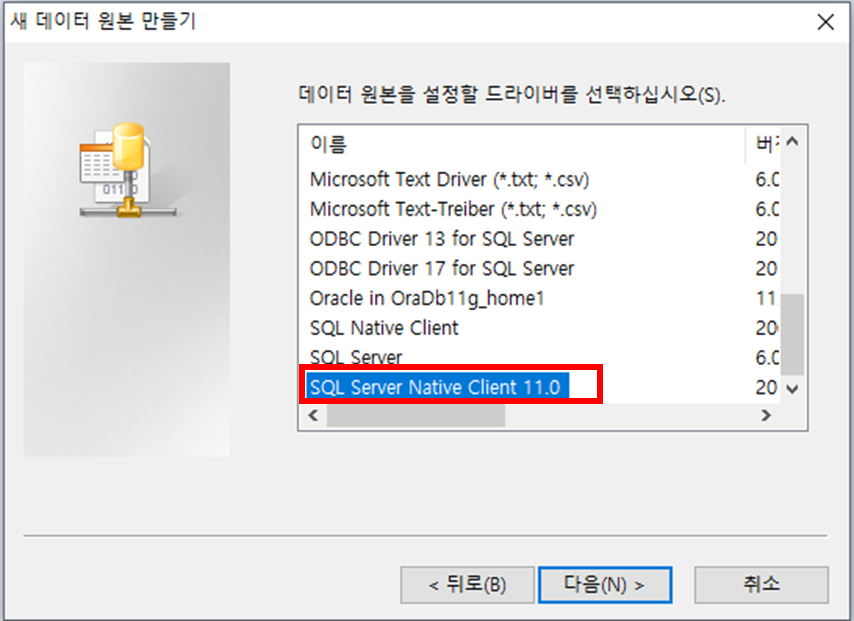 3. MSSQL 서버인 경우 SQL Server Native Client 11.0 을 선택, Oracle 서버인 경우 ODBC Driver for SQL Server 선택