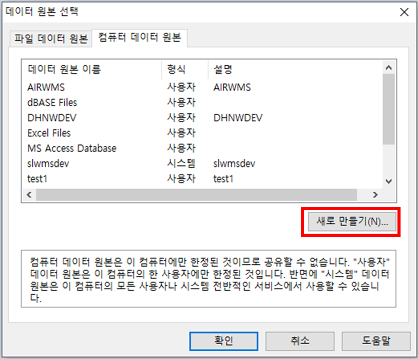 1. 데이터 원본 선택 > 컴퓨터 데이터 원본 > 새로만들기