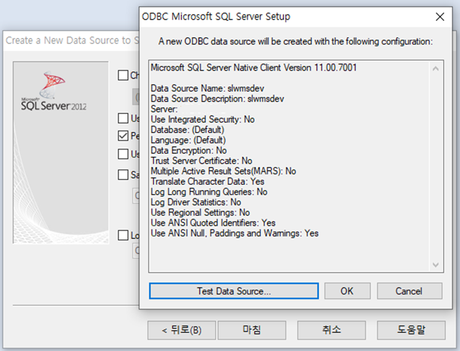 6. 계속해서 다음을 누른 후에 마침을 누르면 아래와 같은 팝업이 뜬다. Test Data Source... 클릭후