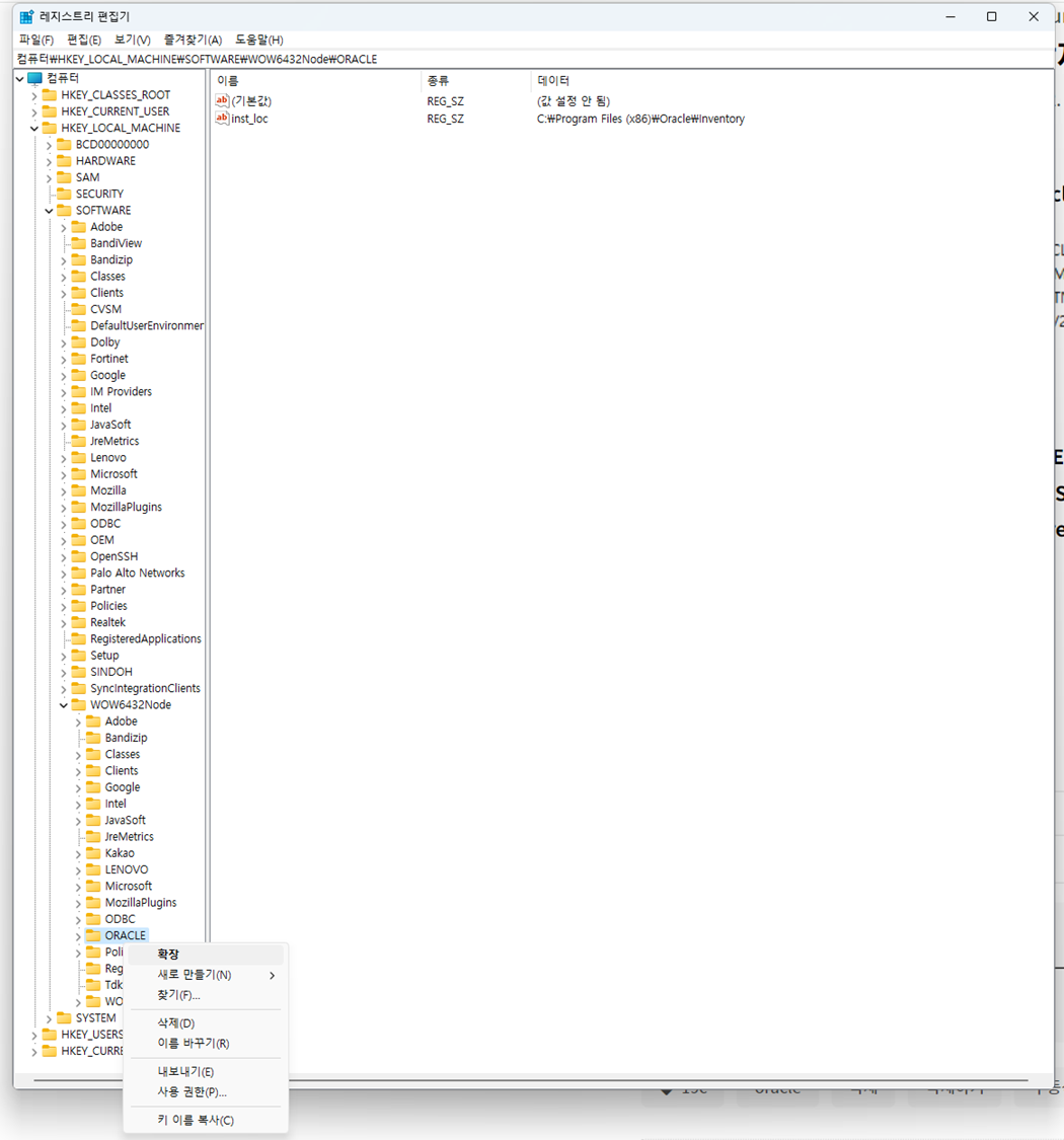 3. 이어서 컴퓨터 > HKEY_LOCAL_MACHINE > SOFTWARE > WOW6432Node > ORACLE* 관련 폴더를 모두 삭제한다.