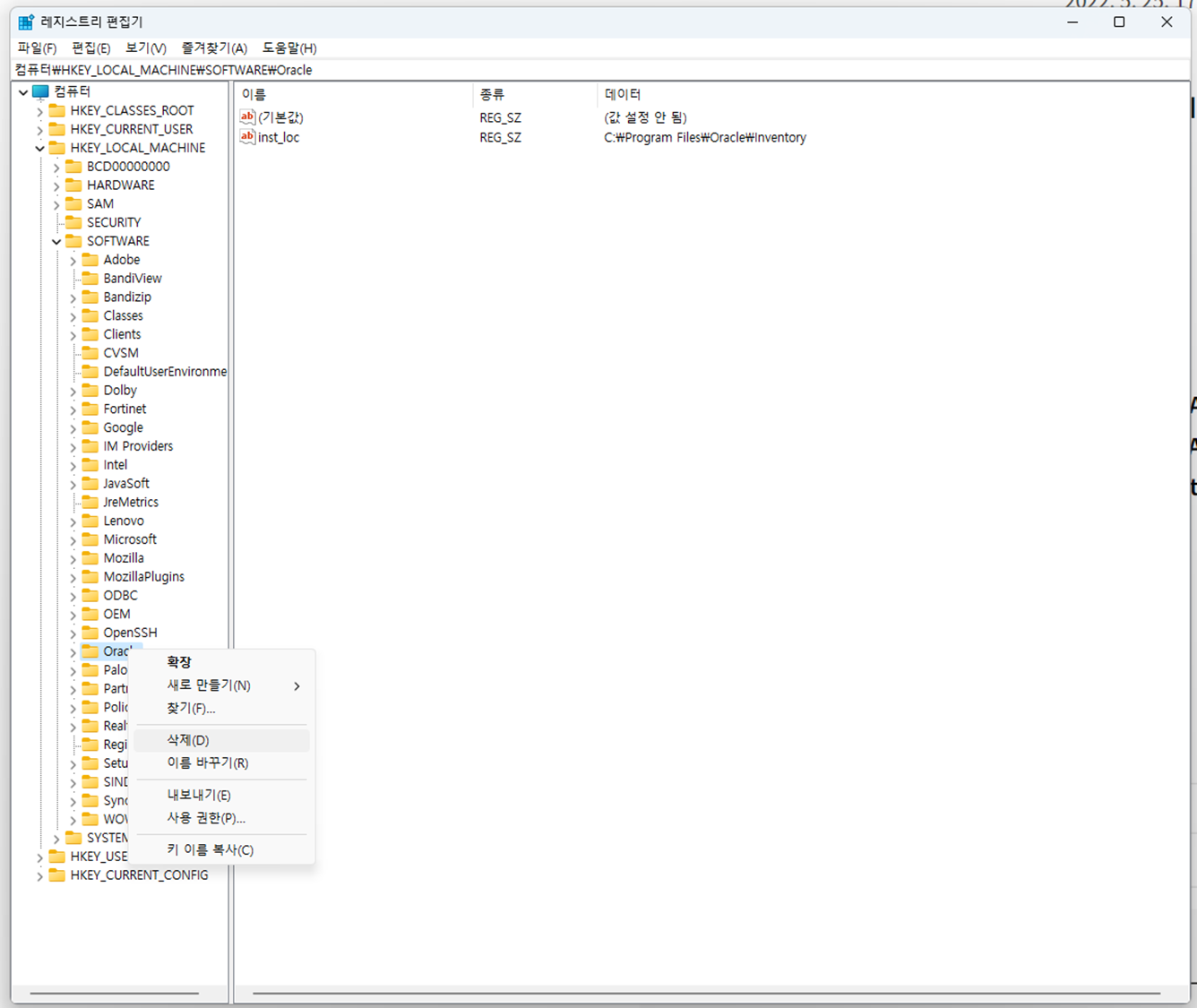 2. 레지스트리 편집기를 열어서 컴퓨터 > HKEY_LOCAL_MACHINE > SOFTWARE > Oracle* 관련 폴더를 모두 삭제한다.