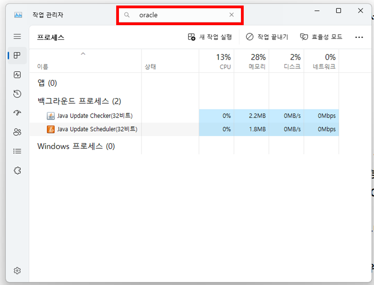 1. 작업관리자를 열어 현재 oracle 관련 프로그램이 실행되고 있는지 확인하고, Oracle 관련 프로그램이 실행되고 있으면 종료해준다.