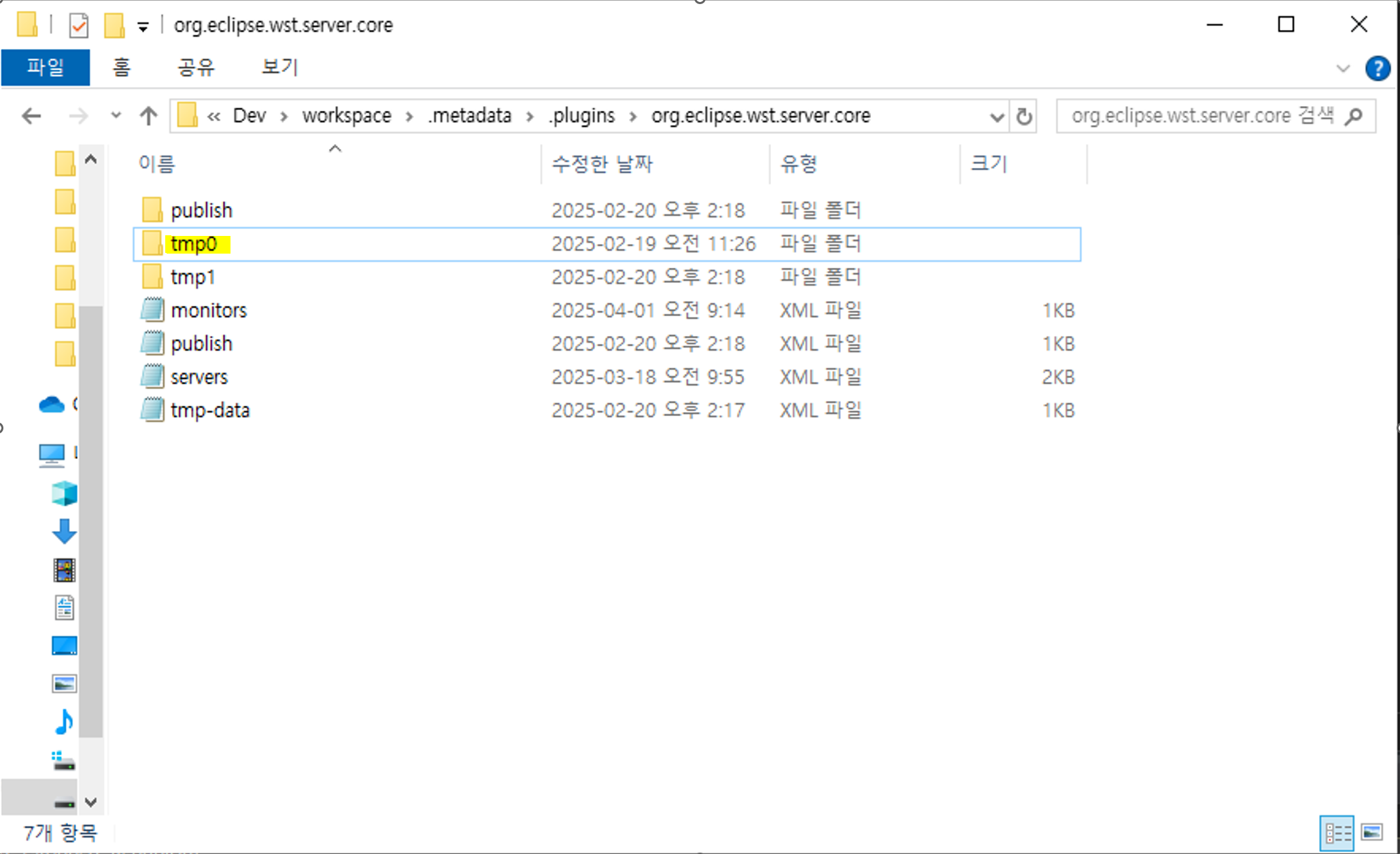 에러 메세지에서 말하는 tmp0 폴더를 삭제 후 Clean 한다. tmp0 폴더는 이클립스 내부 톰캣 버서의 임시 배포 디렉토리이므로, 해당 폴더 삭제하여 톰캣 서버의 임시 리소스들을 강제로 초기화 및 재배포 가능하다.