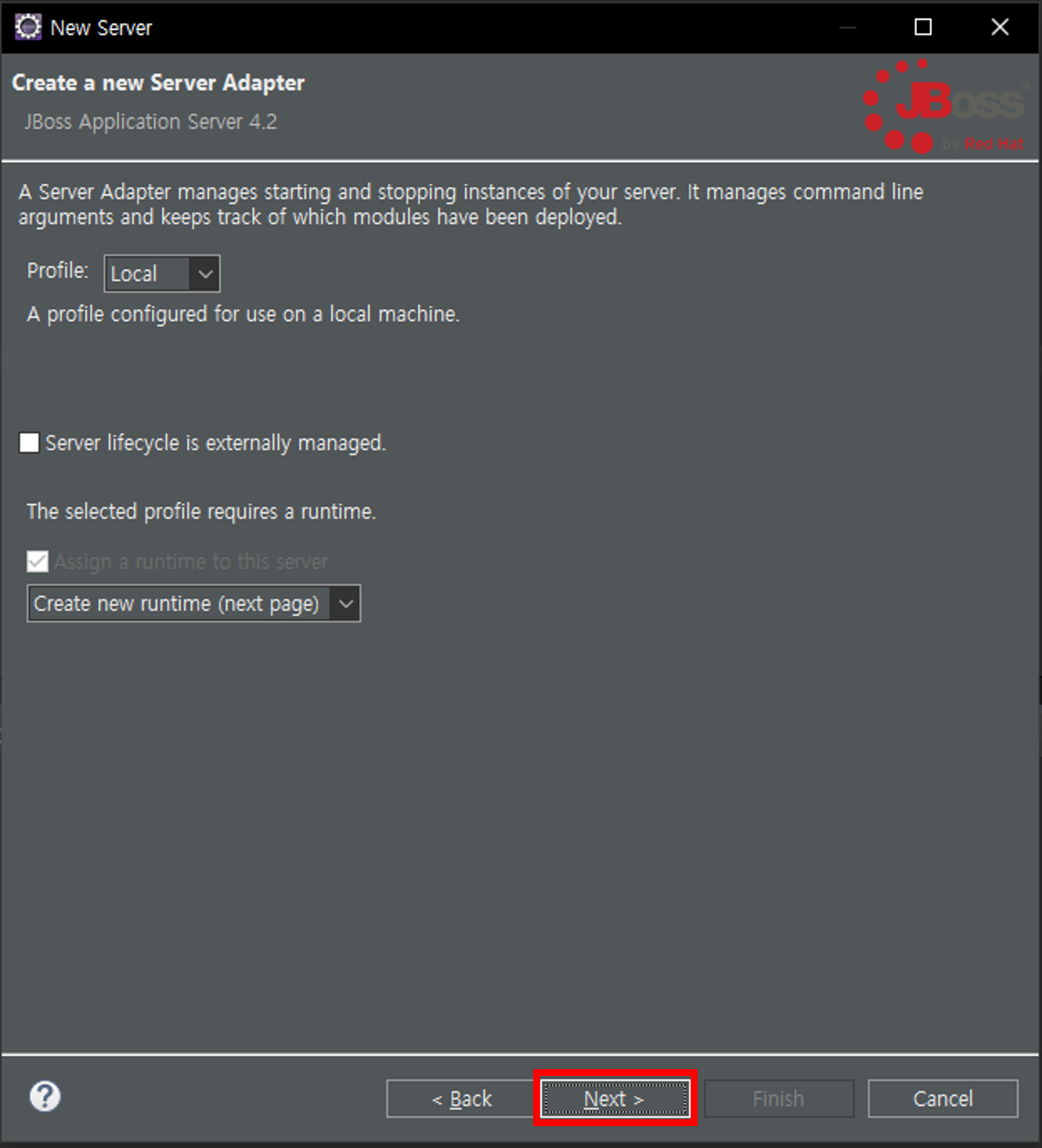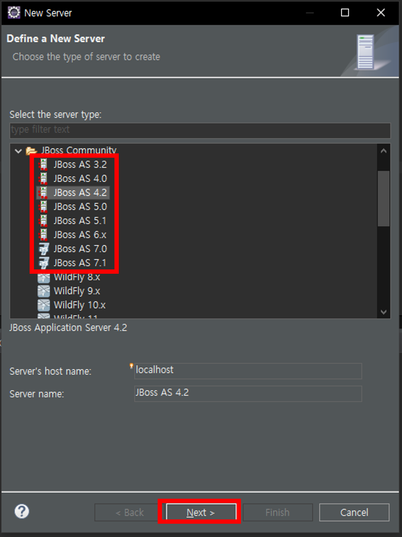 4. JBoss 선택 후 Next 하여 was 추가
