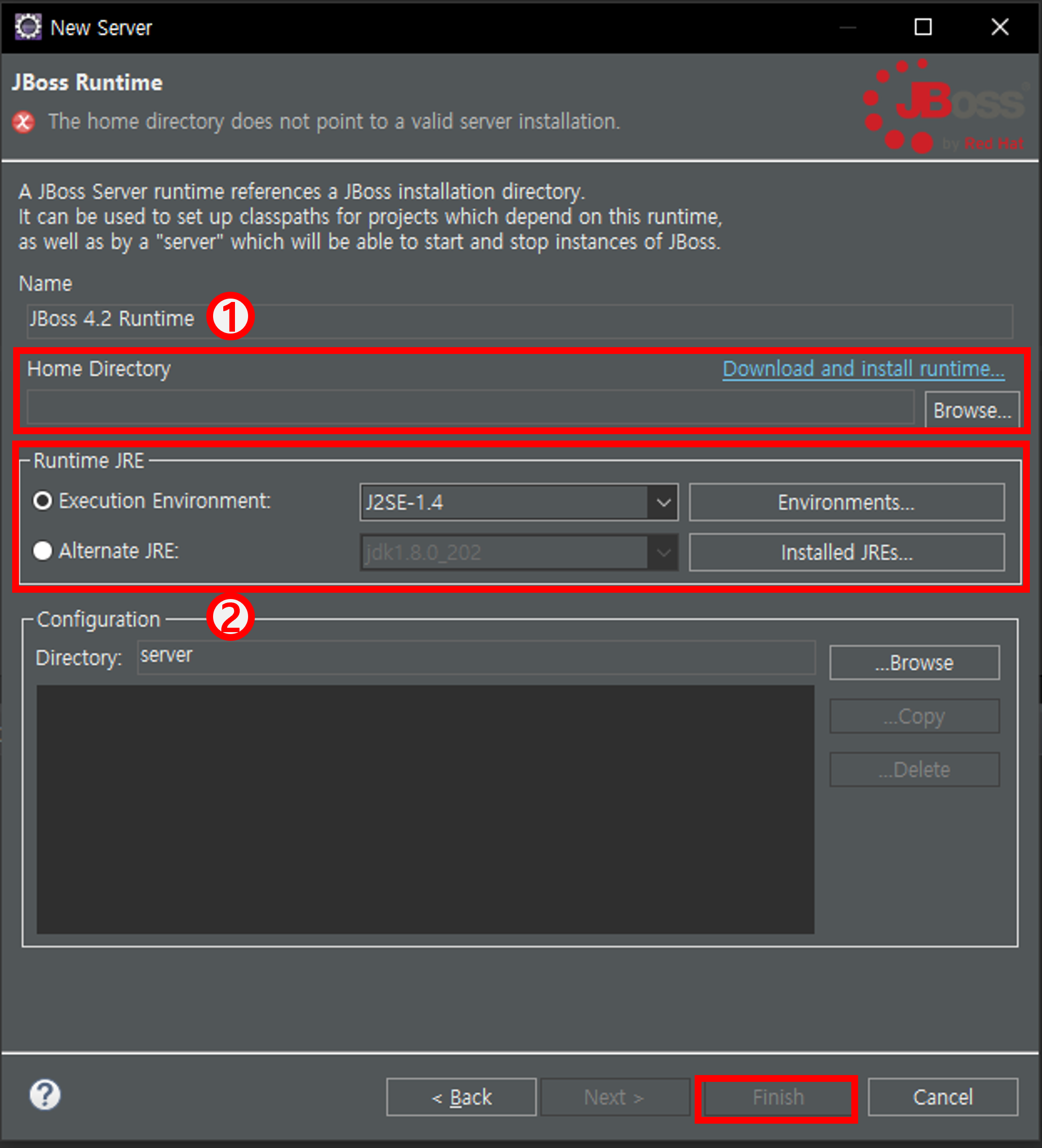 5. 미리 다운받아놓은 JBoss 파일 경로를 입력해주고, JDK 버전을 설정해준다.