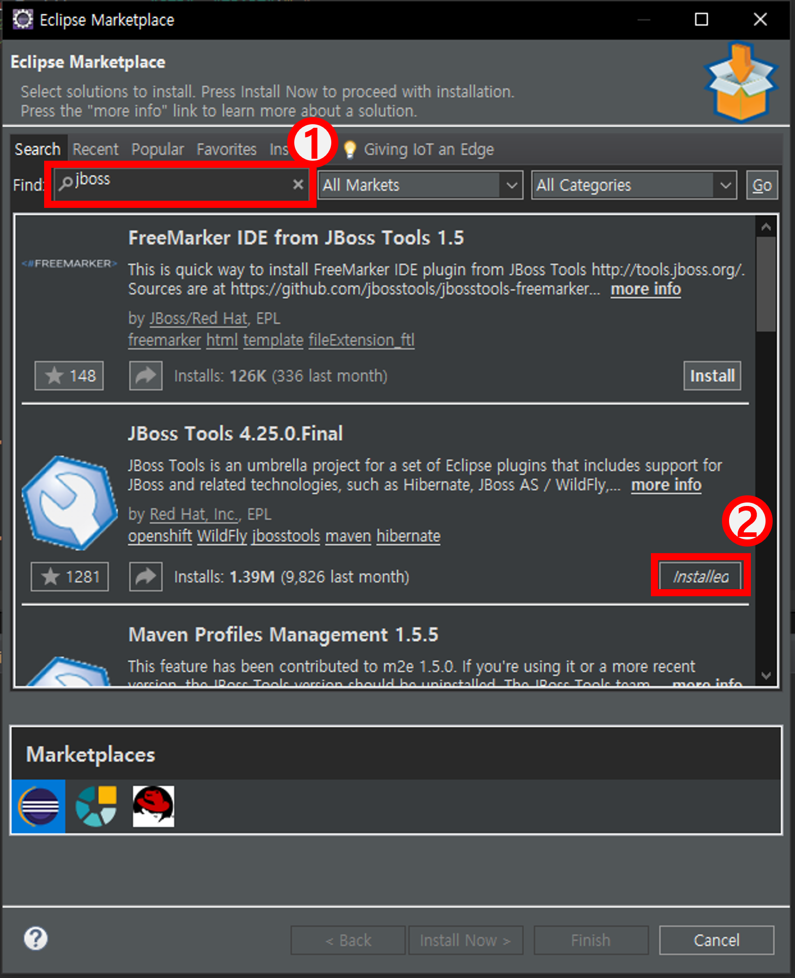 이클립스에서 jboss WAS 서버를 사용하고 싶을때 Eclipse Market place 에서 모듈을 다운받을 수 있다.