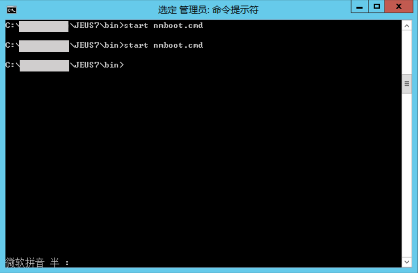 3) cmd로 JEUS가 설치된 폴더의 bin 폴더에 들어가서 'start nmboot.cmd' 명령어 입력한다. (Node Manager 를 실행시키는 것)