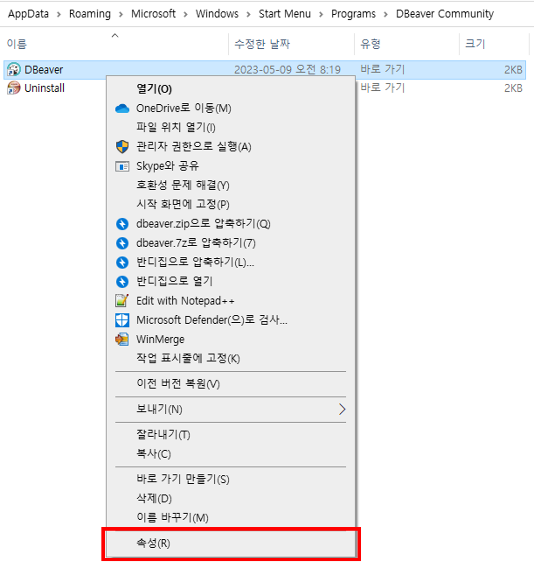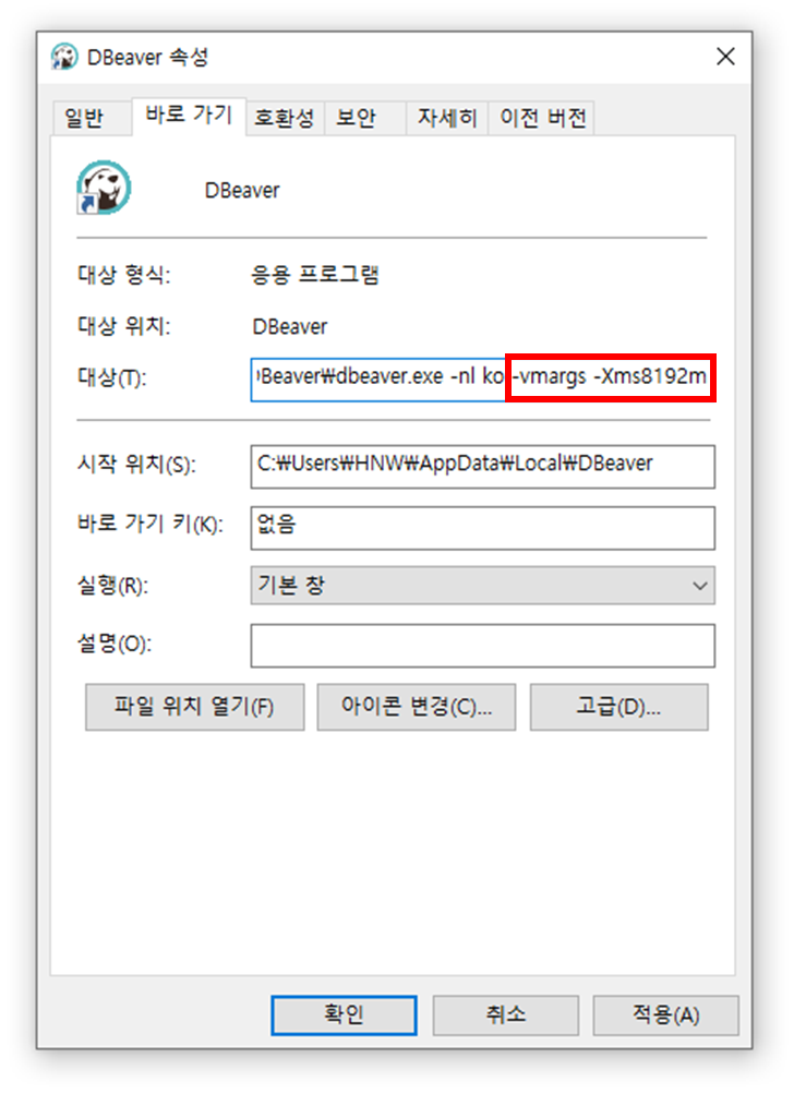 1. DBeaver 아이콘 마우스 우클릭 > 속성
