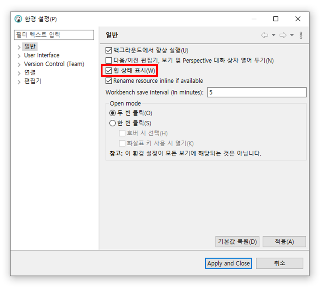 2. DBeaver의 메모리 사용량 보이게 하기. 상단의 윈도우(W) > 설정 > 힙 상태 표시(W)
