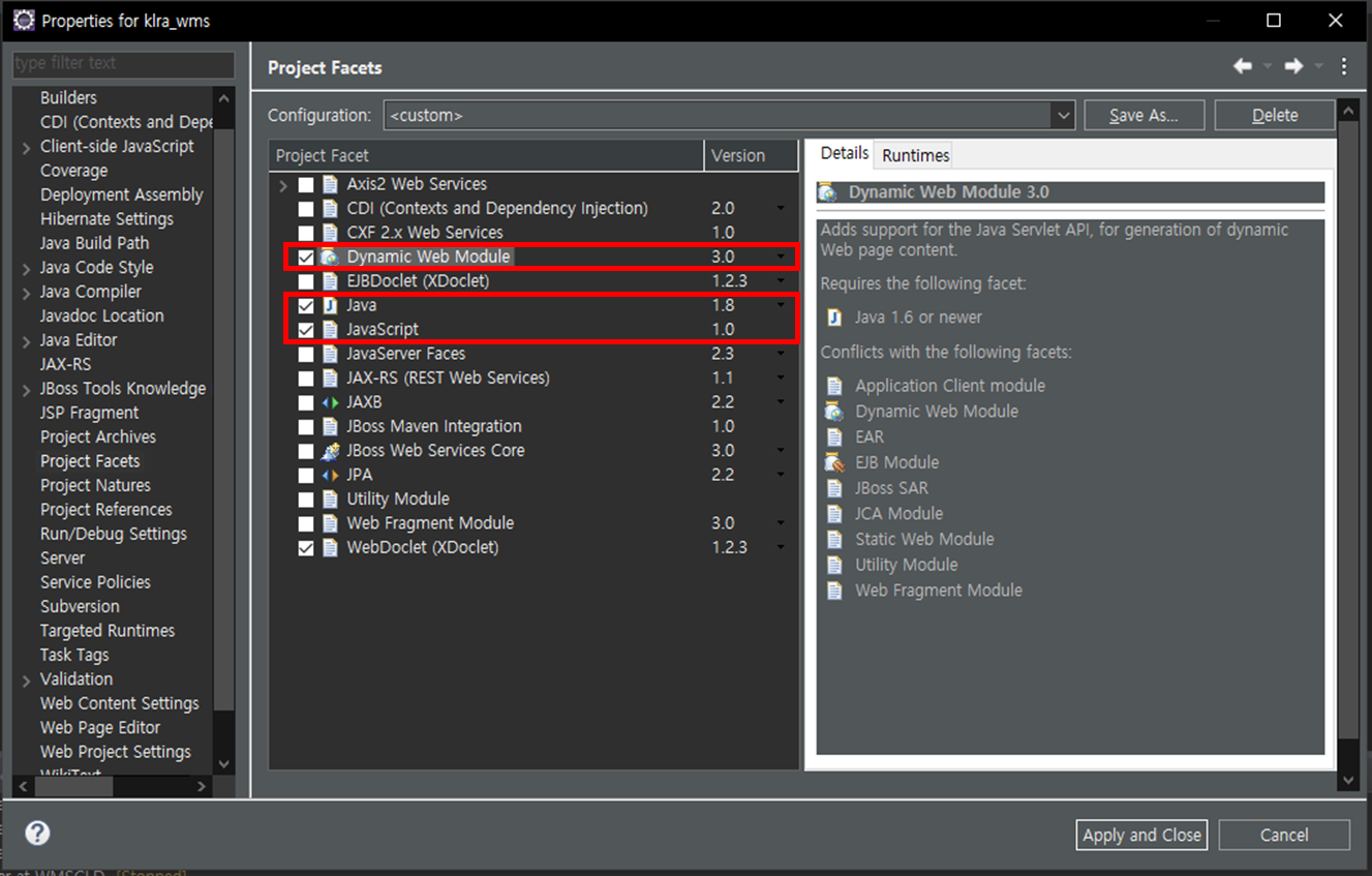 1. 프로젝트 우클릭 > Properties > Project Facets > Dynamic Web Module, Java, JavaScript 체크한 후, 프로젝트 버전에 맞게 Version 을 설정해준다.