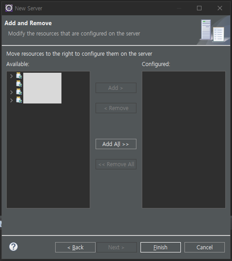 이클립스 Servers 에 신규 서버를 추가할 때, 추가하려는 프로젝트가 Available 리스트에 보이지 않는 경우가 있다.