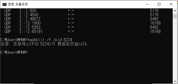 3. taskkill /f /pid [pid번호] 입력하여 프로세스 강제종료