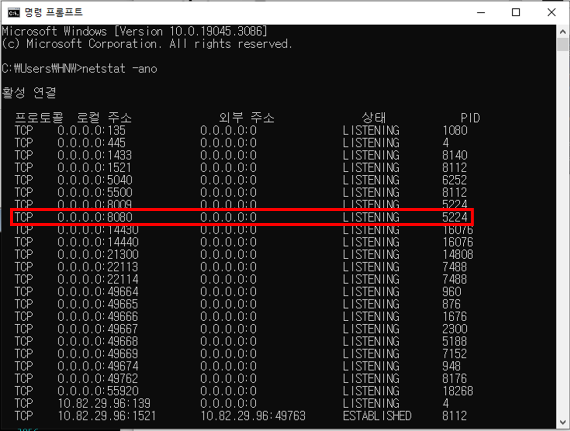 2. netstat -ano 입력하여 8080 포트를 사용하고 있는 프로세스의 PID를 확인한다.