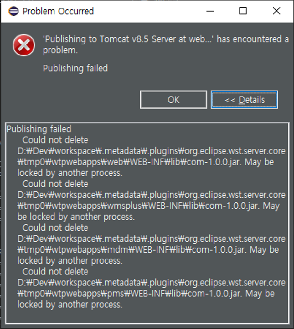 문제상황톰캣 클린시 아래와 같은 에러 메세지와 함께 클린되지 않았다. Could not delete D:\Dev\workspace\.metadata\.plugins\org.eclipse.wst.server.core\tmp0\wtp\webapps\web\WEB-INF\lib\com-1.0.0.jar. May be locked by another process. 원인Tomcat 프로세스가 백그라운드에서 완전히 종료되지 않아서 그렇다. 완전히 종료되지 않았을 경우, 파일이 lock 상태가 되어 clean 불가하다. 해결방법에러 메세지에서 말하는 tmp0 폴더를 삭제 후 Clean 한다. tmp0 폴더는 이클립스 내부 톰캣 버서의 임시 배포 디렉토리이므로, 해당 폴더 삭제하여 톰캣 서버의 임시 리소스들을 강..